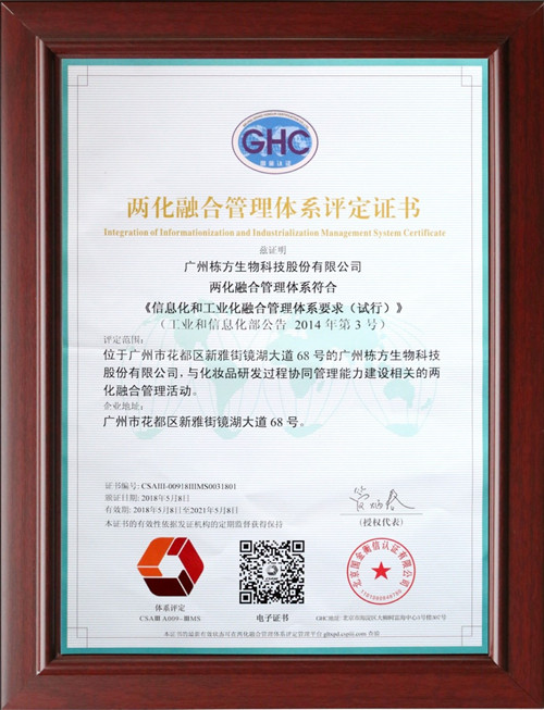 5月8日,棟方股份兩化融合管理體系順利通過專家組審核,獲得頒發(fā)兩化融合管理體系評定證書,成為率先通過該體系評估審核的化妝品研發(fā)制造企業(yè)。棟方股份成功實現(xiàn)兩化融合,企業(yè)競爭力將會得到進(jìn)一步的提升,在管理水平和工作效率方面得到明顯改善,必會更好服務(wù)于客戶和市場。